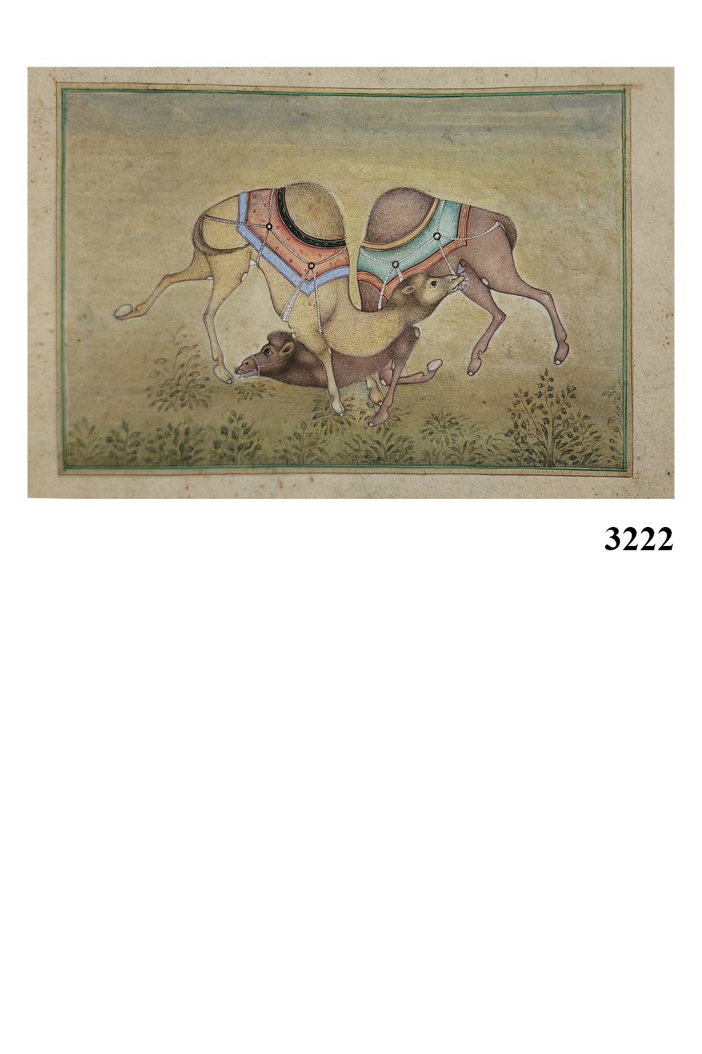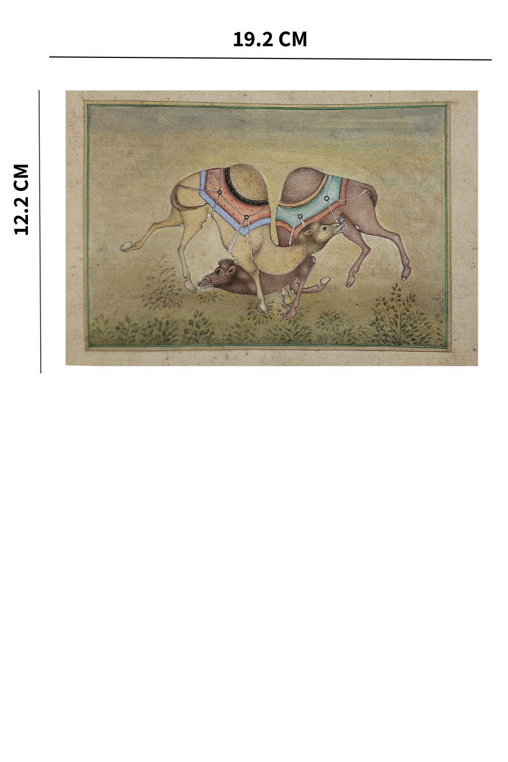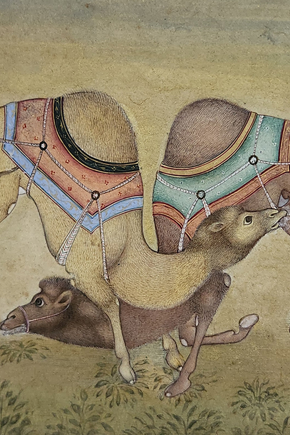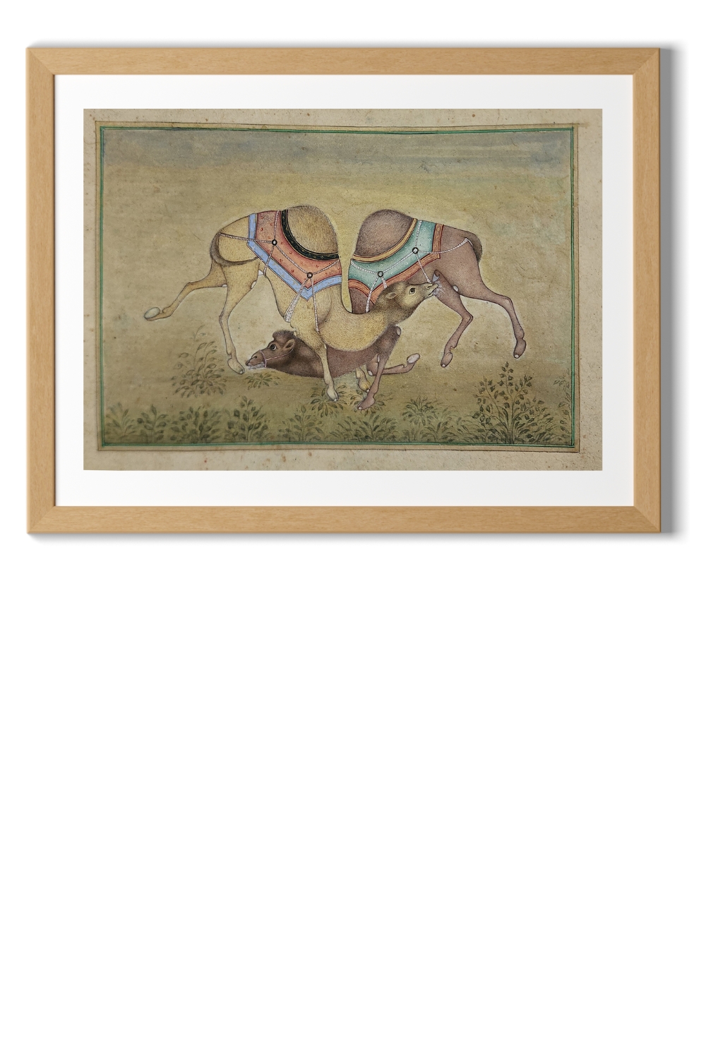 The background features subtle greenery, offering a harmonious contrast to the vibrant colors of the camels' adornments. This minimalistic approach allows the central figures to remain the focal point. The use of natural pigments and gold leaf enhances the richness and depth of the painting, ensuring its timeless appeal. Every detail, from the camels' textured fur to the intricate patterns of their saddles, highlights the artist's mastery of this traditional art form.