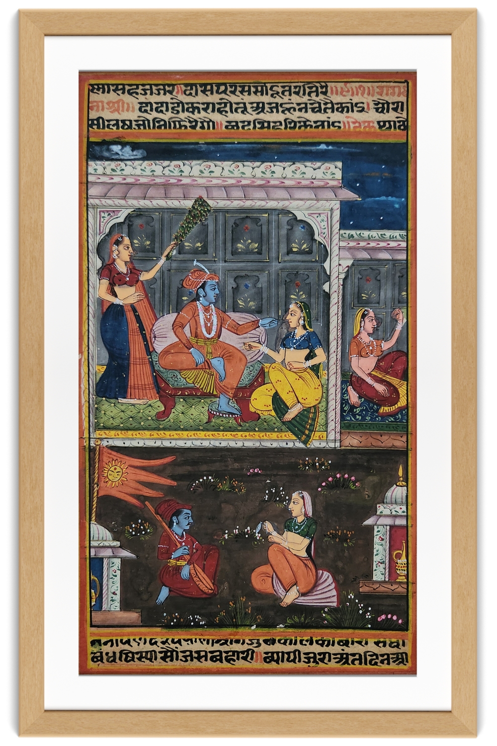 - Dual Composition: The painting beautifully integrates two distinct yet harmonious portrayals of Krishna.