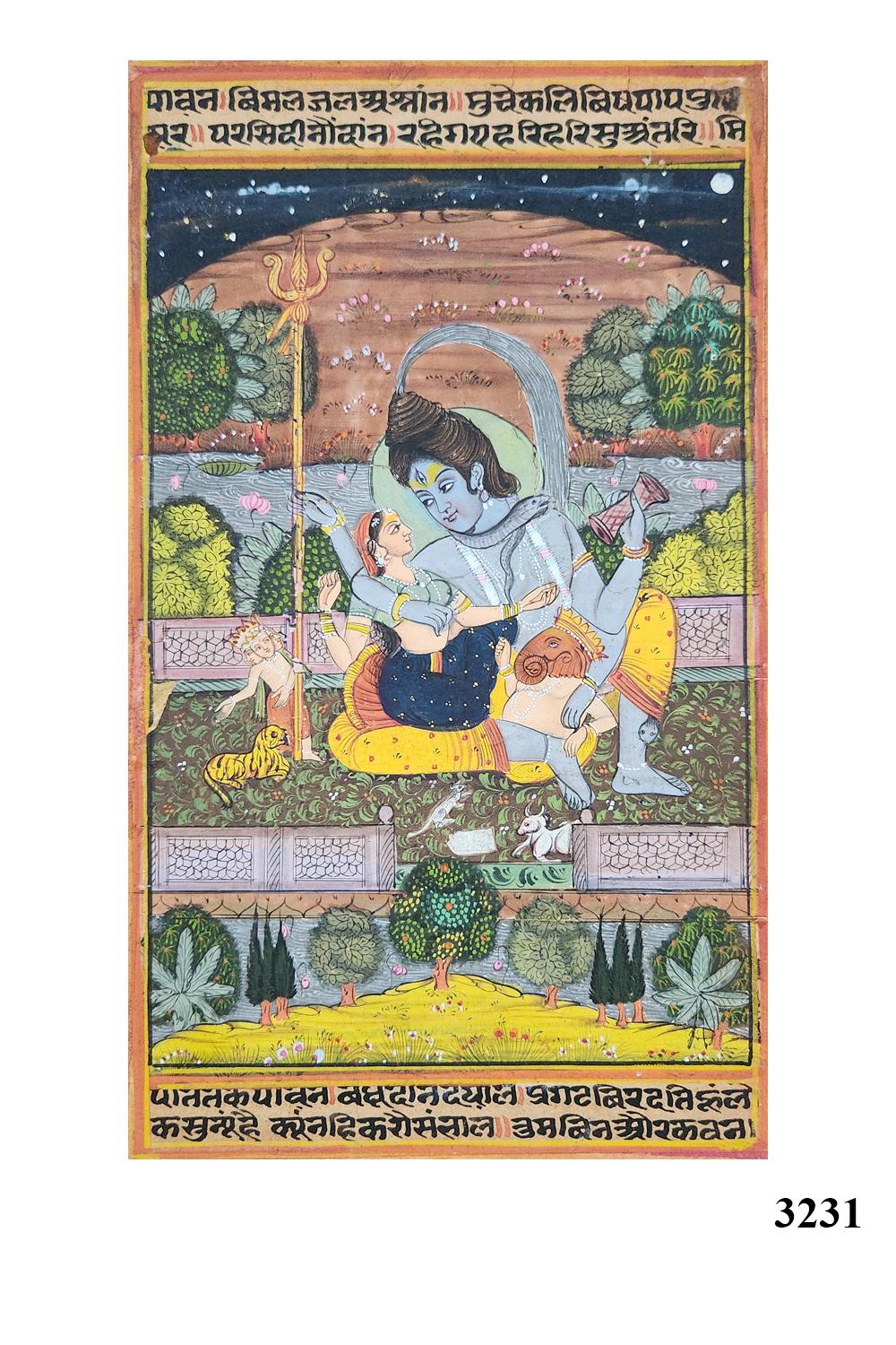 Shiva Parvati – Divine Embrace in Kailash is a stunning miniature artwork rooted in Hindu mythology and love symbolism. The scene depicts Lord Shiva tenderly holding Parvati in a moment of celestial affection, seated on a tiger skin throne amidst nature's lush beauty. With the crescent moon overhead and Mount Kailash in the background, the composition evokes tranquility and spiritual harmony. Shiva’s iconic attributes—the crescent moon, flowing Ganga, and trident—are intricately detailed, while Parvati's graceful posture adds softness and balance to the composition. Surrounded by dense flora, lotus blooms, and vibrant gardens, this painting beautifully captures divine love and balance between masculine and feminine energies. Sanskrit verses at the top and bottom lend it spiritual depth and authenticity.