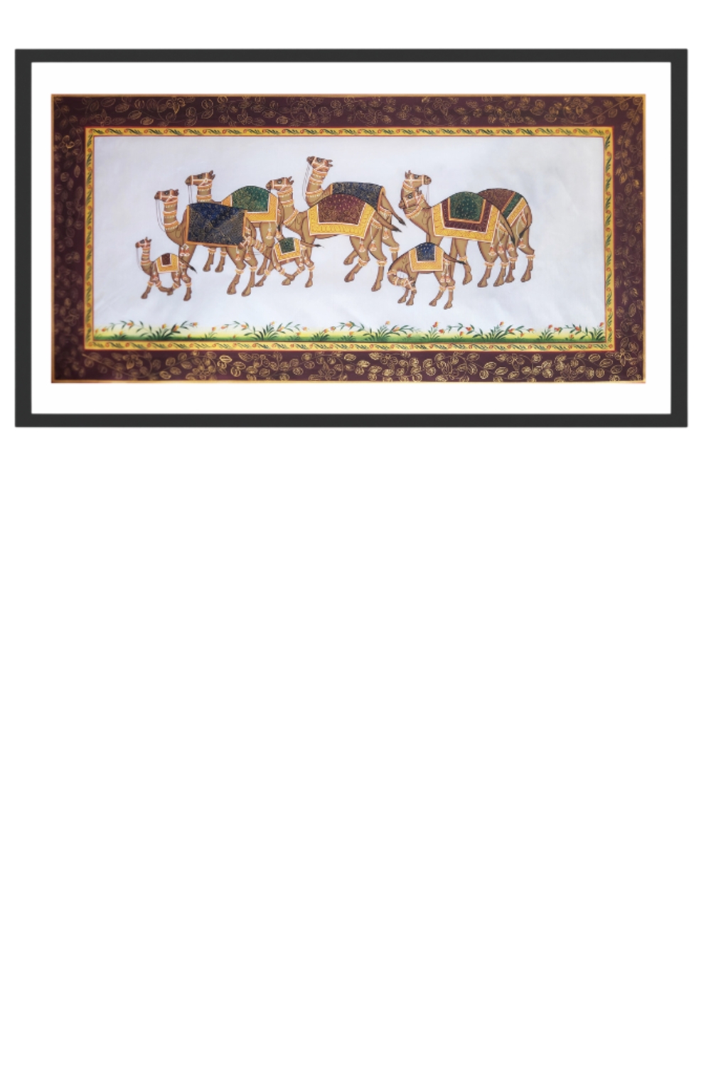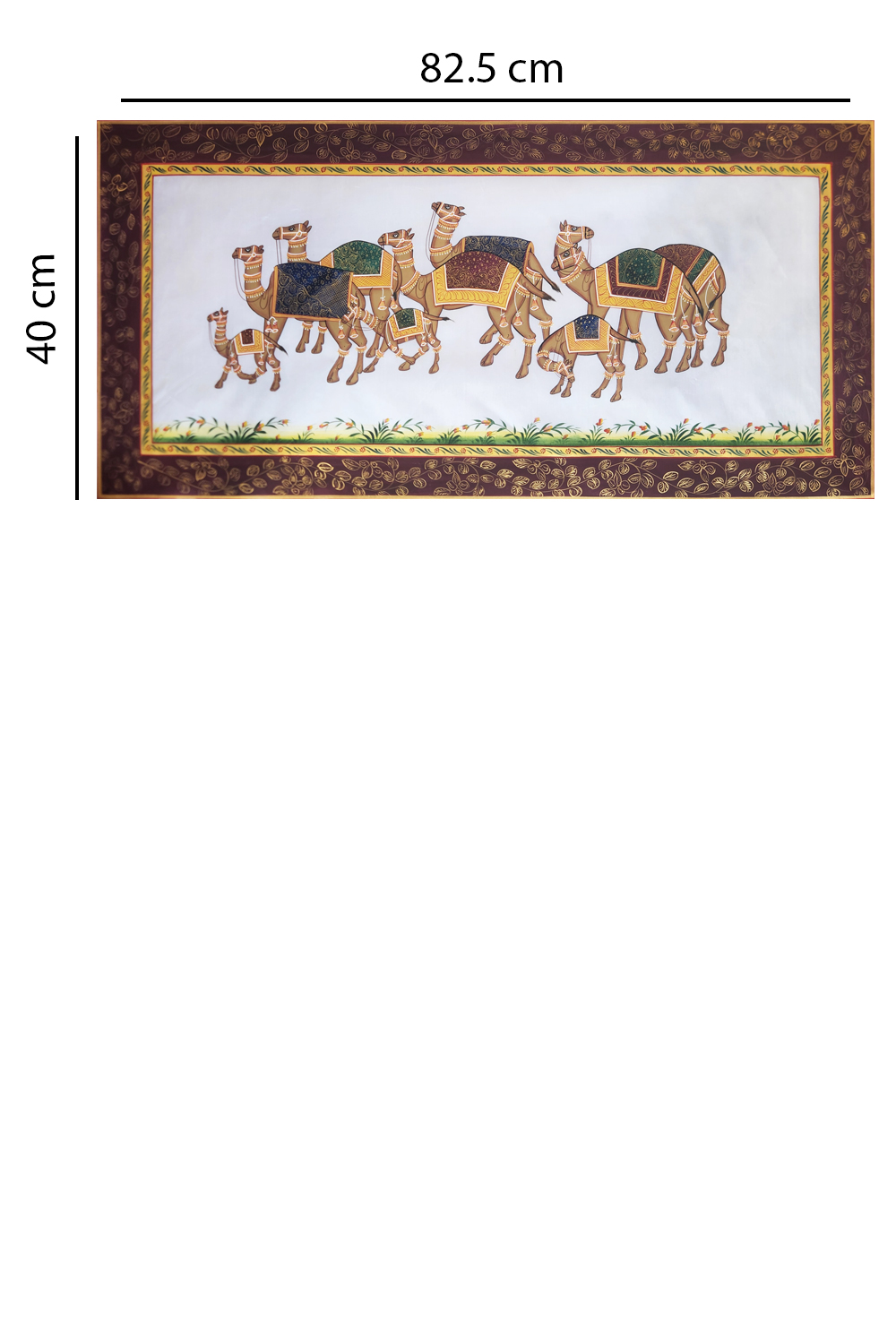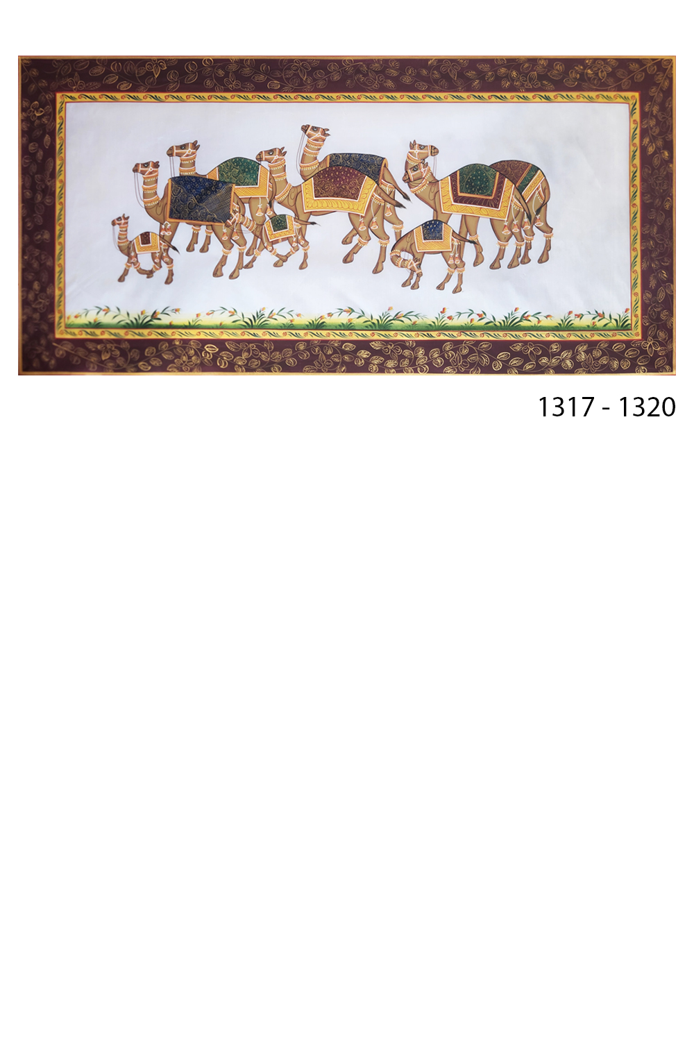 Regal Procession is a masterfully hand-painted silk artwork that embodies the elegance and rhythm of traditional desert caravans. Each camel is adorned in ornate textiles and embellishments, their regal bearing captured with remarkable finesse using authentic mineral pigments. Painted on rich silk fabric, the piece blends cultural heritage with artistic precision—an homage to the grandeur of royal parades and nomadic life. The earthy tones and intricate detailing bring warmth, motion, and storytelling to any space. Whether displayed in a heritage home or a contemporary setting, this artwork serves as a refined celebration of India’s desert traditions and ceremonial spirit.