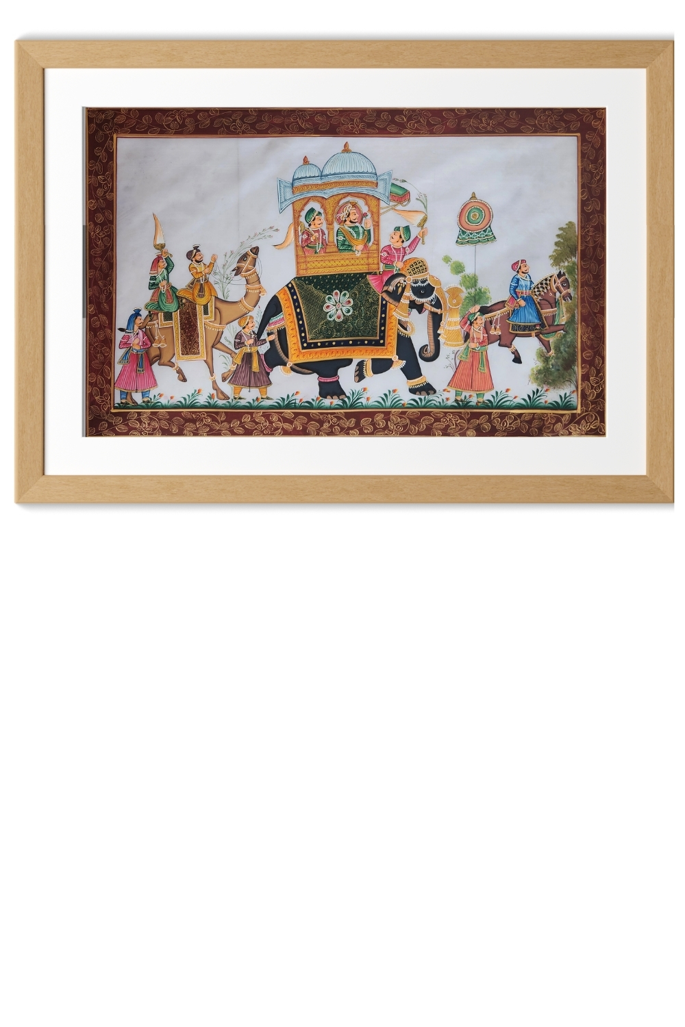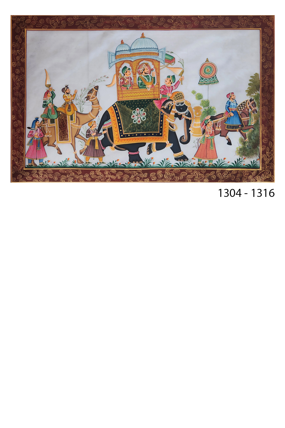 - Features a detailed royal procession with elephant, musicians, guards, and noble figures
