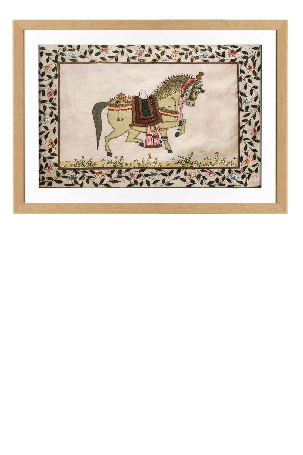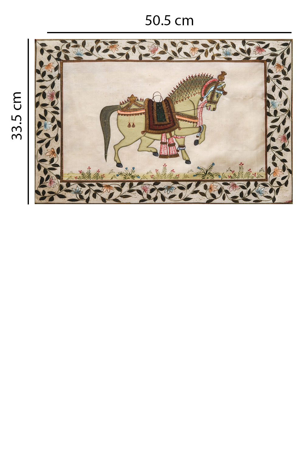 Noble Grace is a tribute to equestrian royalty, rendered with the finesse of traditional Indian artistry on a fine silk canvas. The majestic horse stands poised in a dignified profile, adorned with an elaborate saddlecloth, ornamental breastplate, and gilded reins—all painted with delicate precision. The artist’s use of original mineral colors gives this piece a luminous richness, adding depth and texture that echo centuries of miniature painting traditions. A soft floral border in deep blue and golden hues frames the artwork with classic sophistication. Perfect for adding heritage charm to any space, this piece speaks of valor, elegance, and the grandeur of regal processions.