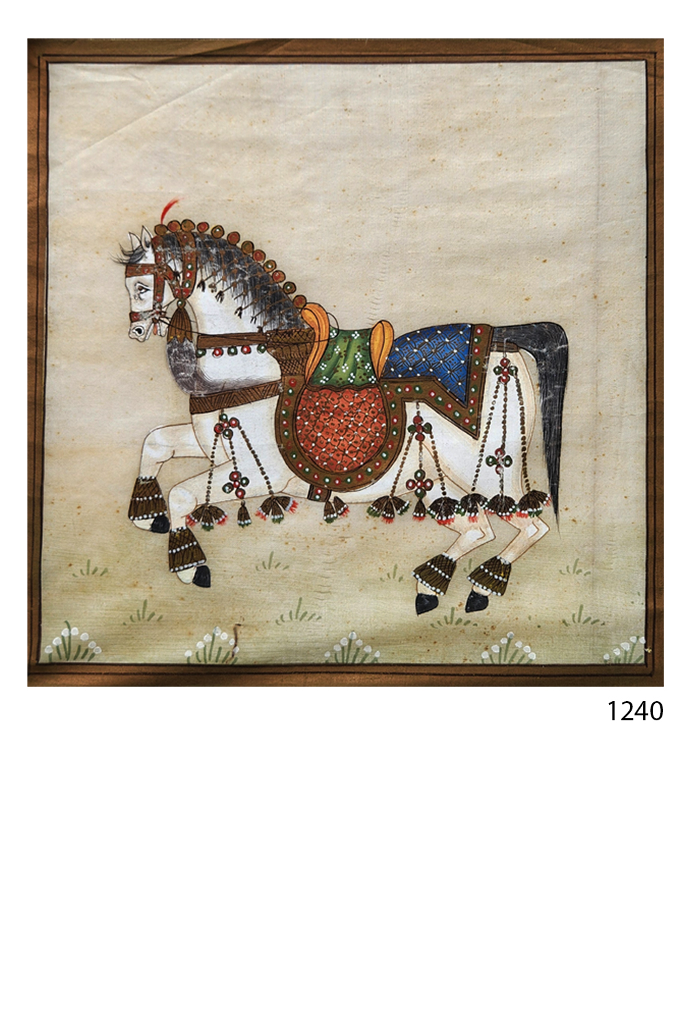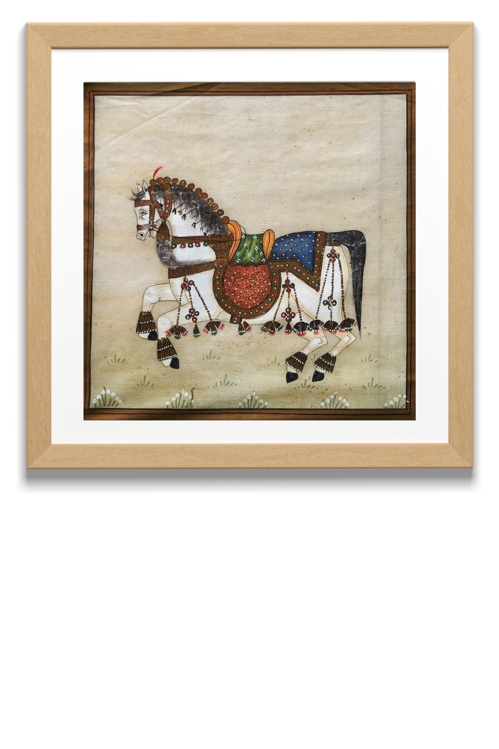 The Royal Sentinel captures the poised elegance of a ceremonial horse, rendered with precision and reverence on fine silk. Standing in regal composure, the horse is lavishly dressed in traditional finery—ornate saddlecloths, gilded harnesses, and richly detailed trappings, each element painted with care using original mineral colors. The painter’s attention to anatomical grace and fabric layering breathes life into the composition, while the square format lends it a balanced, contemplative presence. The minimal background draws the viewer’s focus onto the horse’s proud stance, echoing the majestic symbolism of nobility, loyalty, and heritage. A timeless emblem of grace, this painting is ideal for collectors of miniature-style art and heritage-inspired décor.