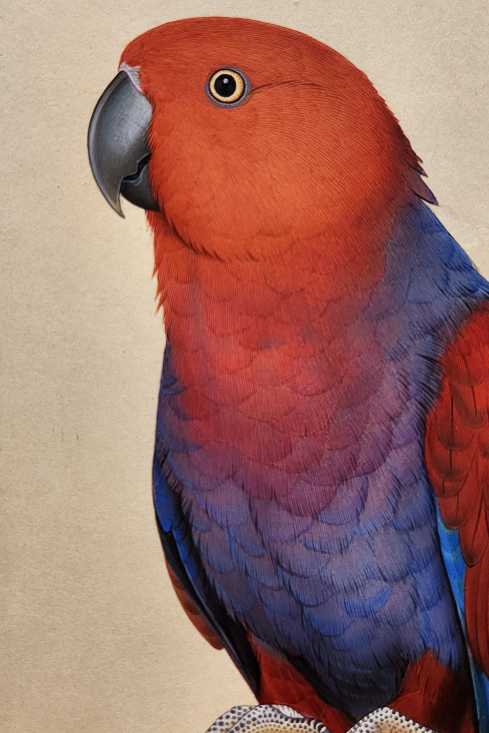 Product Content: The 'Red Horizon Parrot Miniature Painting' captures the vibrant beauty of a red parrot with subtle blue tones, creating a captivating and colorful scene. This miniature artwork, meticulously detailed, brings nature's elegance into your space, offering a perfect accent for bird lovers and art enthusiasts alike.