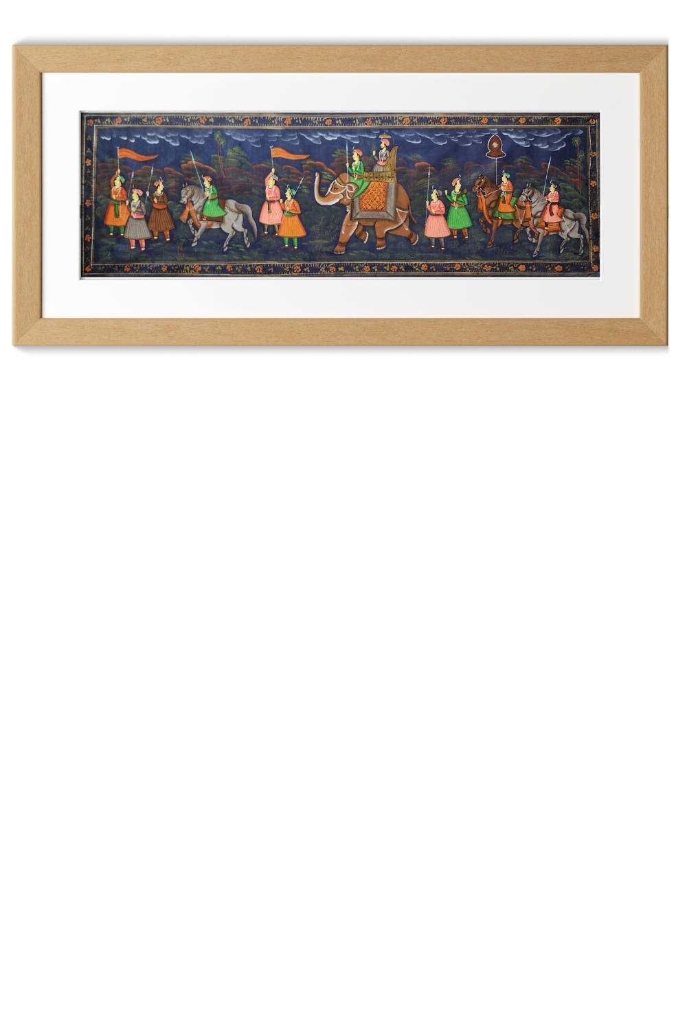 - Depicts a complete royal procession with elephants, horses, attendants, and courtly figures