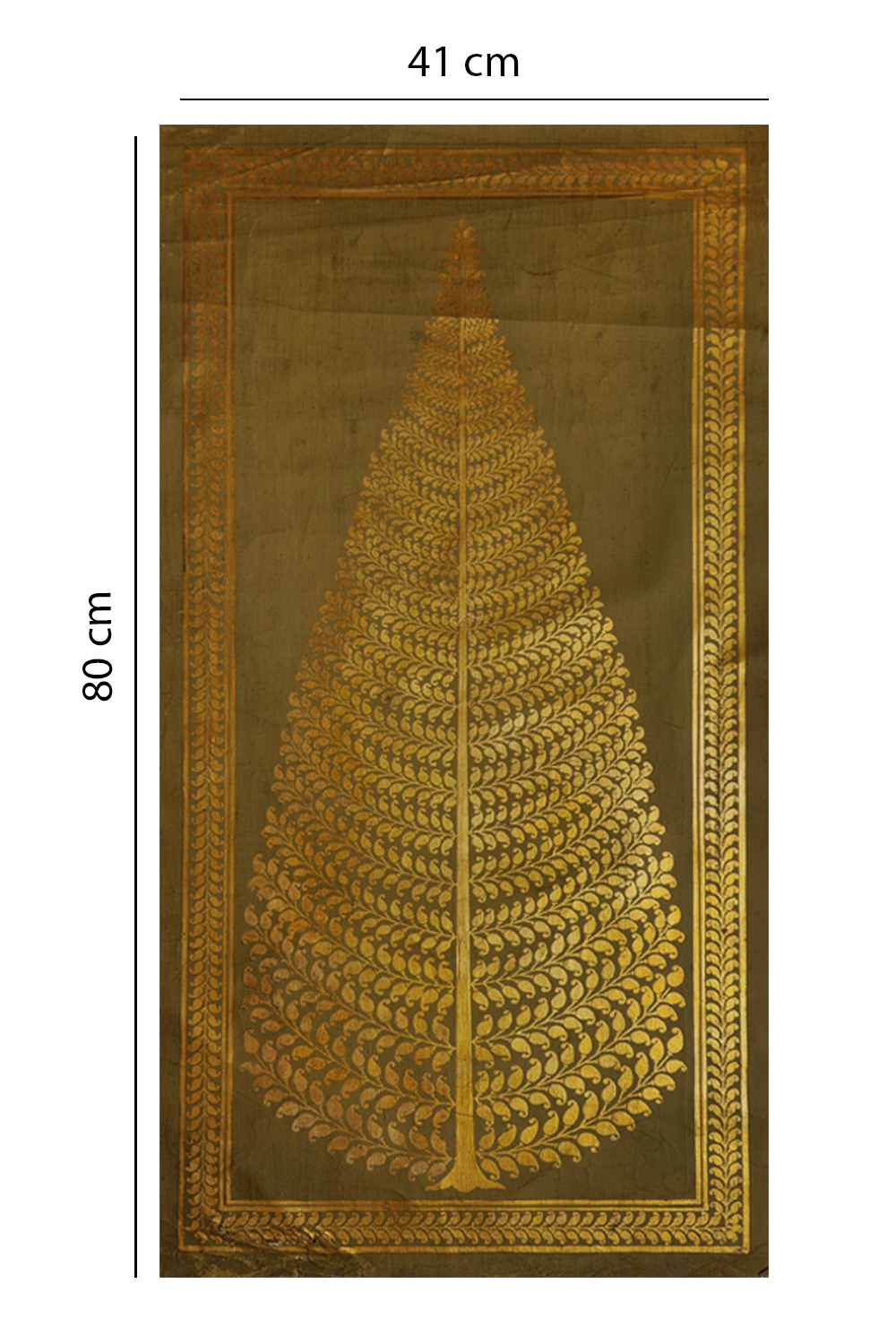“Swarna Vriksha” is a tribute to the sacred symbolism of the tree of life, rendered in a visually arresting composition that blends symmetry, ornamentation, and spiritual depth. The central motif—a golden tree with delicately patterned leaves—rises in a triangular formation, evoking growth, balance, and divine energy. The dark bronze background enhances the luminosity of the gold, creating a striking contrast that feels both regal and meditative. Surrounding the tree is a finely detailed rectangular border, echoing temple architecture and miniature painting traditions. Crafted entirely with original mineral pigments, this panel carries the tactile richness and chromatic permanence of heritage techniques. Whether displayed in a curated interior or used as a campaign visual, it offers timeless elegance and cultural resonance.