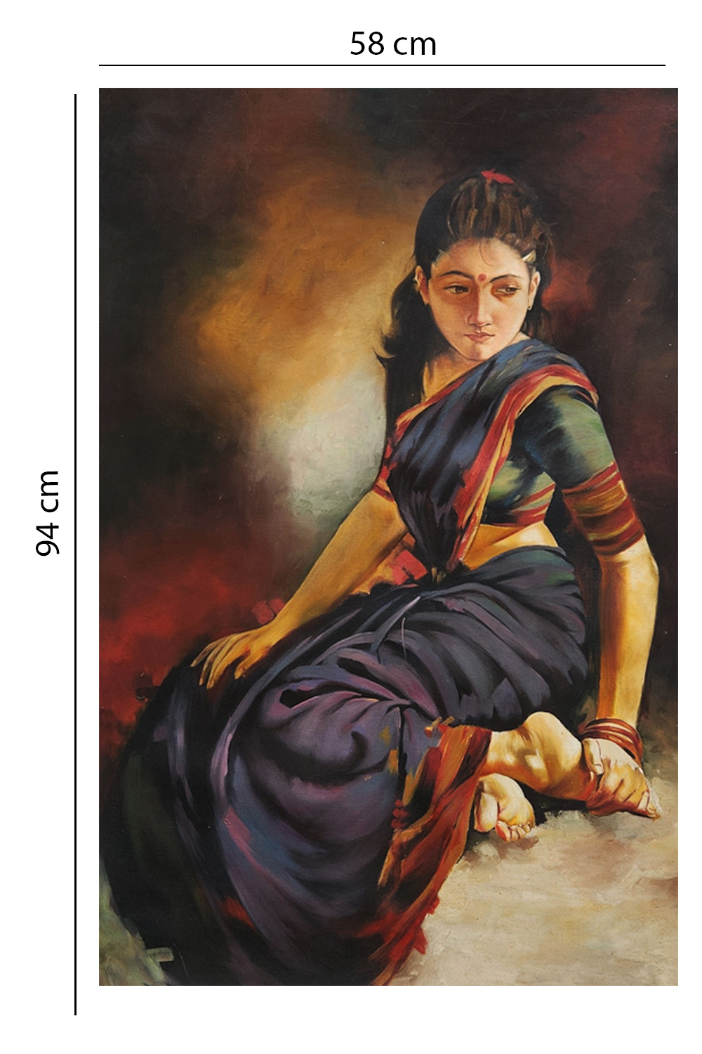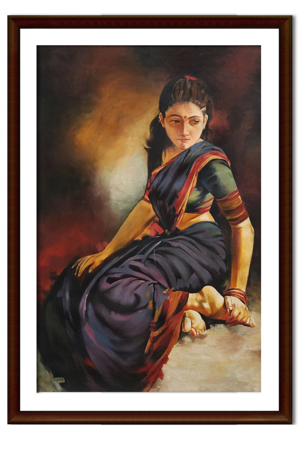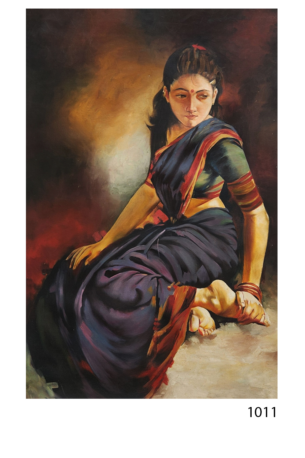 - Depicts a woman in traditional Indian attire, seated in introspection