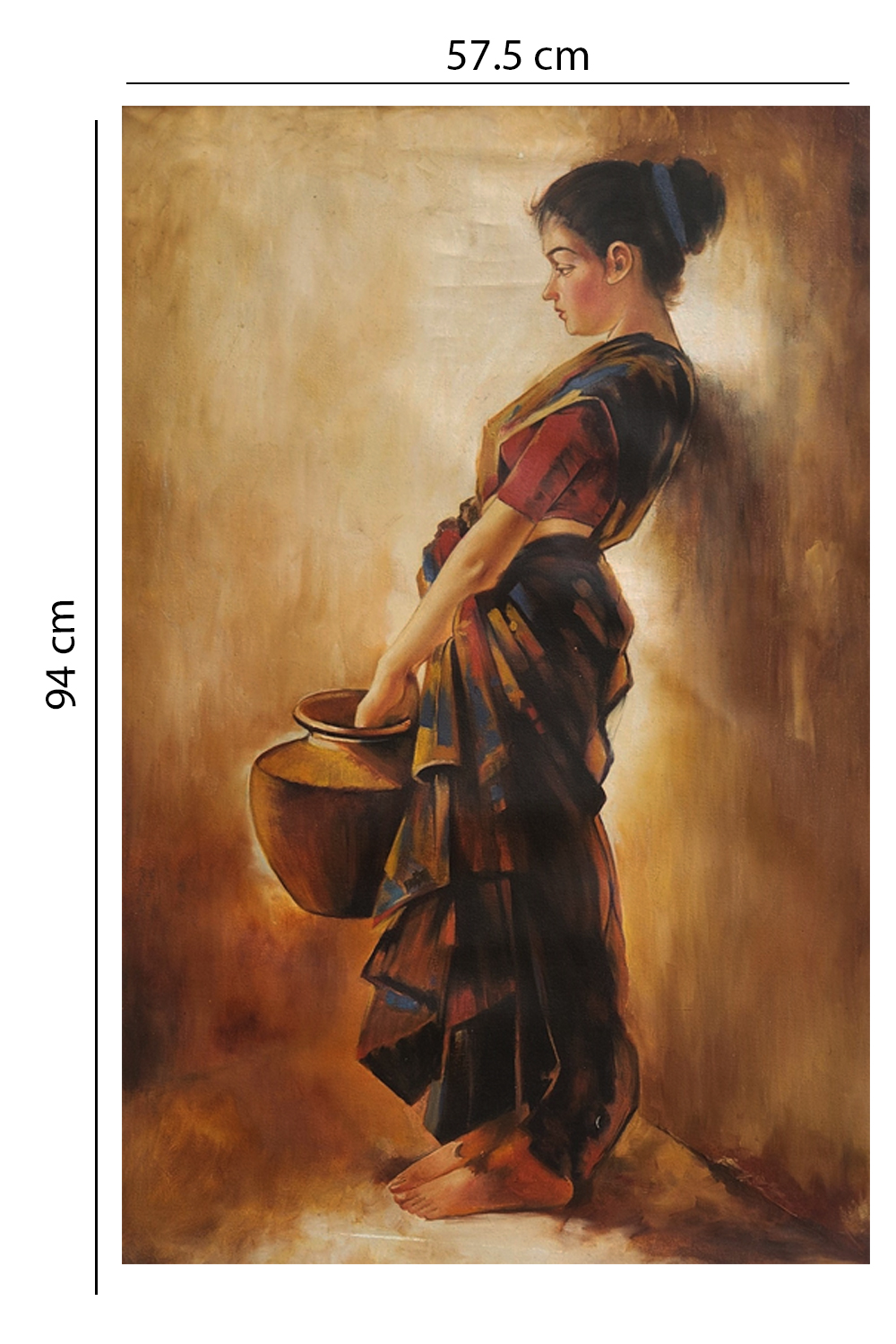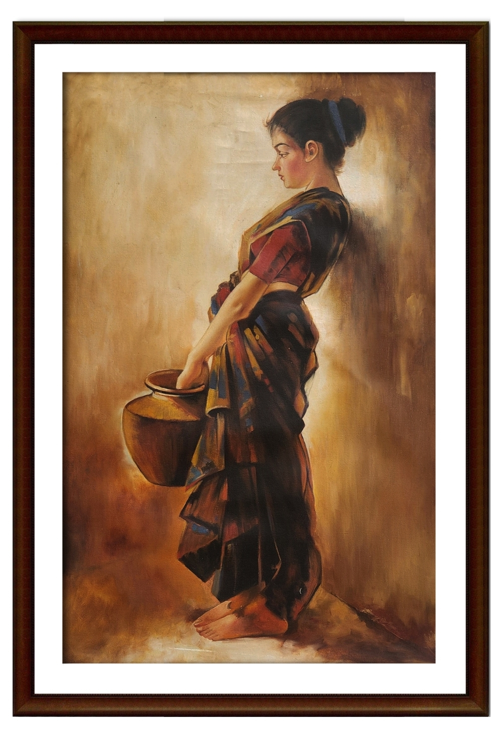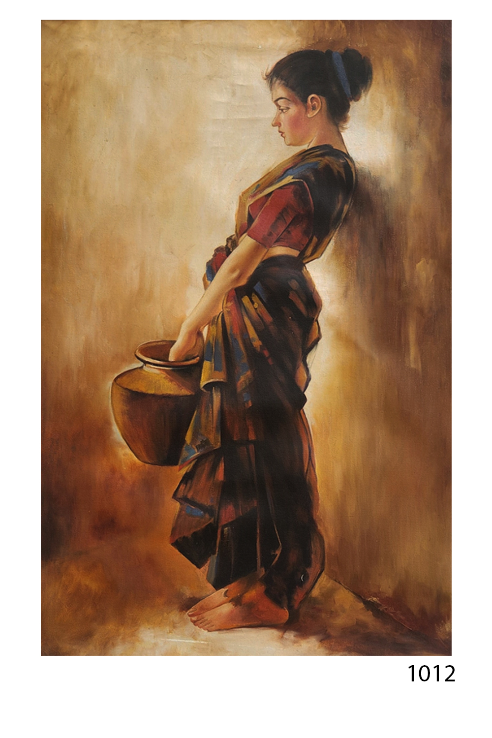 - Depicts a woman in traditional attire, holding a clay pot in quiet reflection