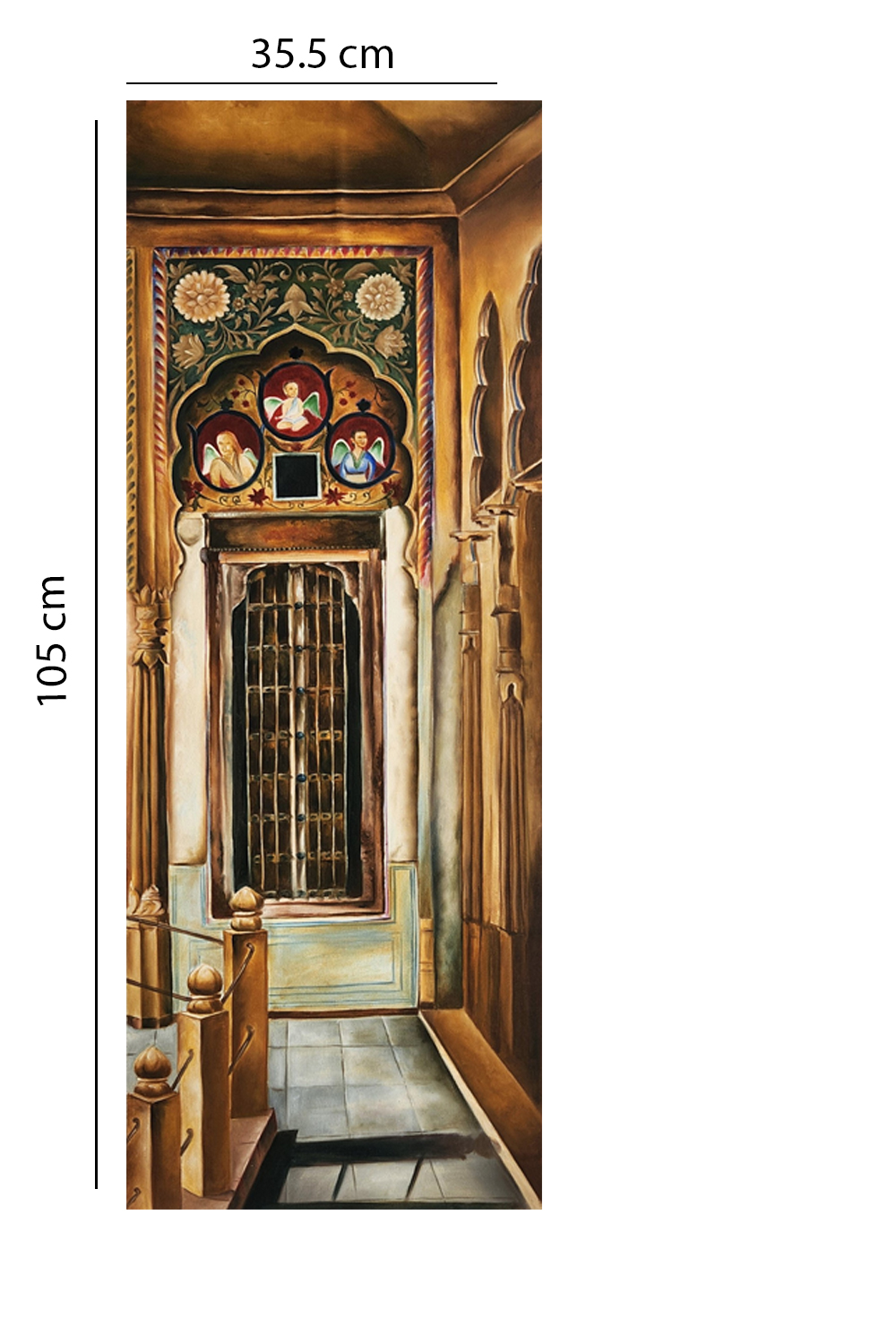 “Darwazon Ka Saawan” is a celebration of architectural ornamentation and cultural memory, capturing the façade of a heritage interior with exquisite precision. The painting features a richly decorated wall adorned with floral and geometric carvings, crowned by three arched niches that house painted portraits—each framed in delicate motifs that echo miniature traditions. Below the niches, a latticed window flanked by carved columns anchors the composition, while the tiled floor and perspective lines draw the viewer into the depth of the space. The warm palette of terracotta, ochre, and muted greens evokes the ambiance of royal havelis and temple interiors. Hand-painted using original mineral pigments, this oil panel carries the tactile richness and chromatic permanence of traditional techniques. It’s a piece that speaks to heritage, craftsmanship, and the poetry of built spaces—ideal for interiors that honor cultural storytelling and architectural beauty.