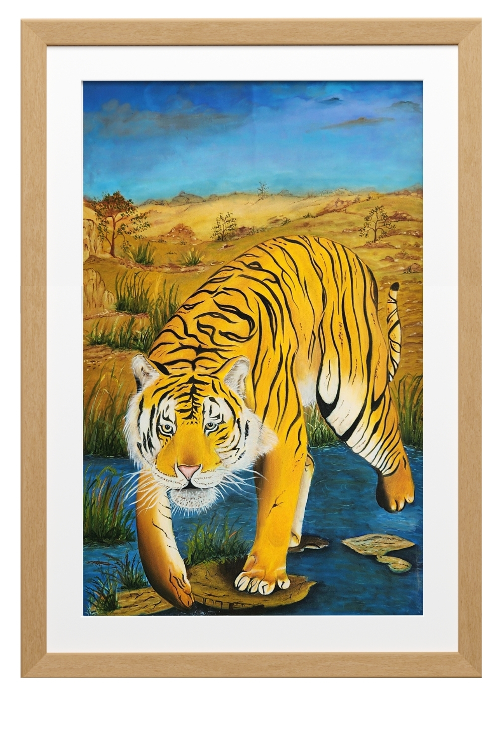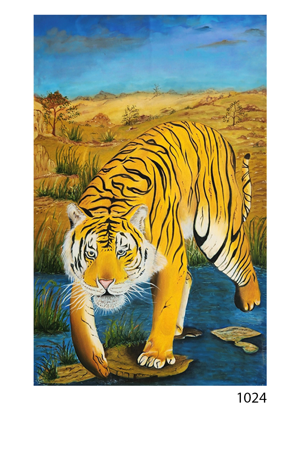 - Depicts a tiger in motion, crossing a stream with natural grace
