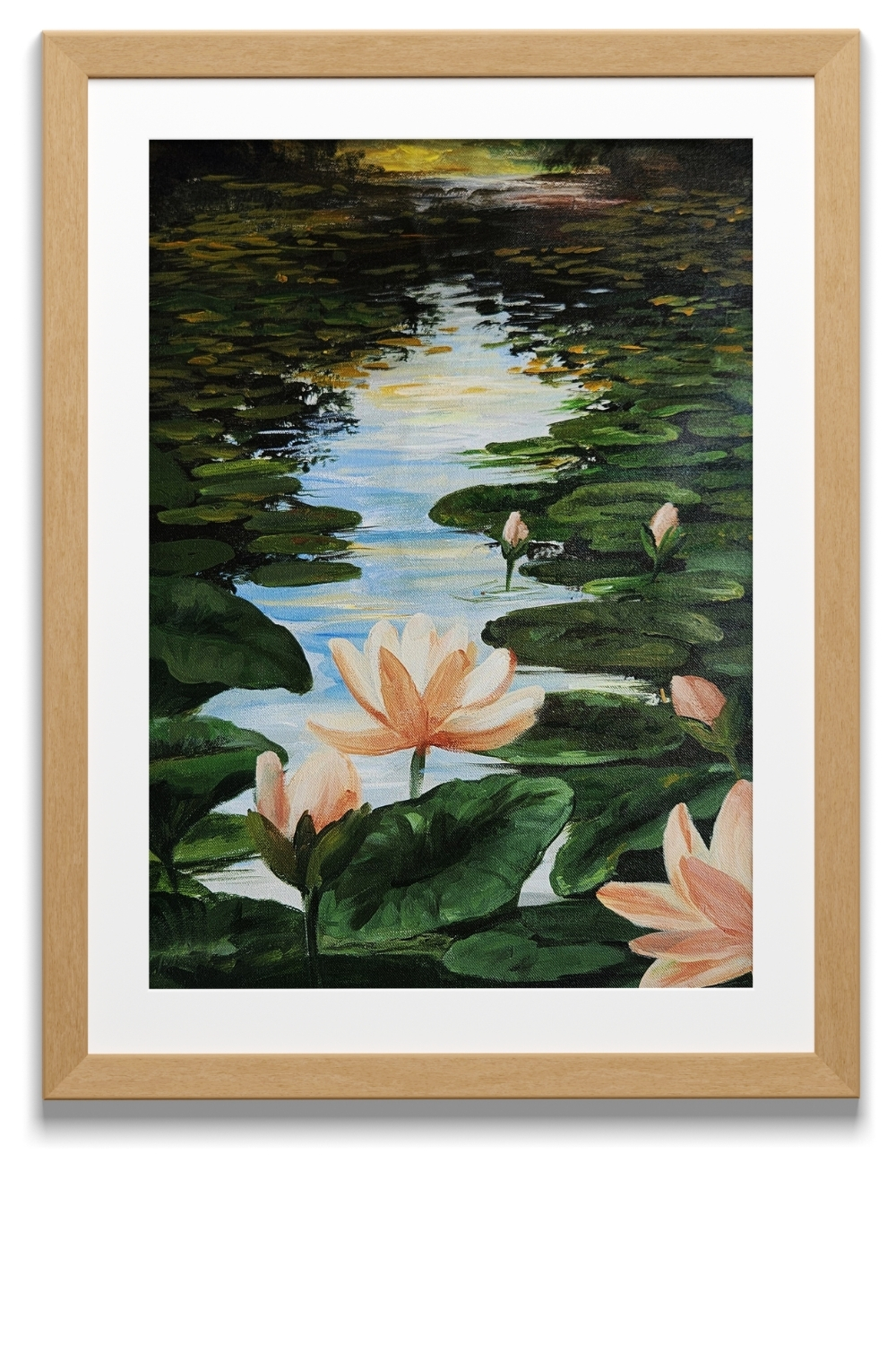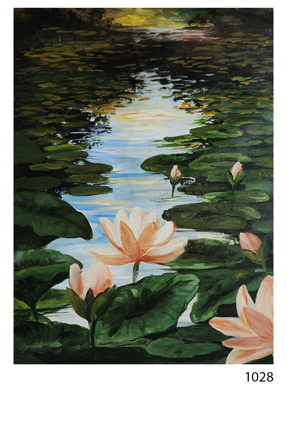 “Lotus Reverie at Dusk” is a serene silk painting that evokes the quiet poetry of nature. Rendered with original mineral pigments on fine silk, this piece portrays a meditative water scene where lotus blossoms unfurl gently among lush lily pads. The sky transitions from golden yellow to deep twilight hues, reflecting softly in the water and lending the composition a sense of depth and stillness. Each lotus is painted in varying stages of bloom, symbolizing renewal and grace. The artist’s brushwork balances delicate detailing with fluid abstraction, making this piece ideal for interiors that seek cultural richness and emotional calm. Rooted in Indian miniature traditions yet expansive in its visual rhythm, this painting invites contemplation and connection.