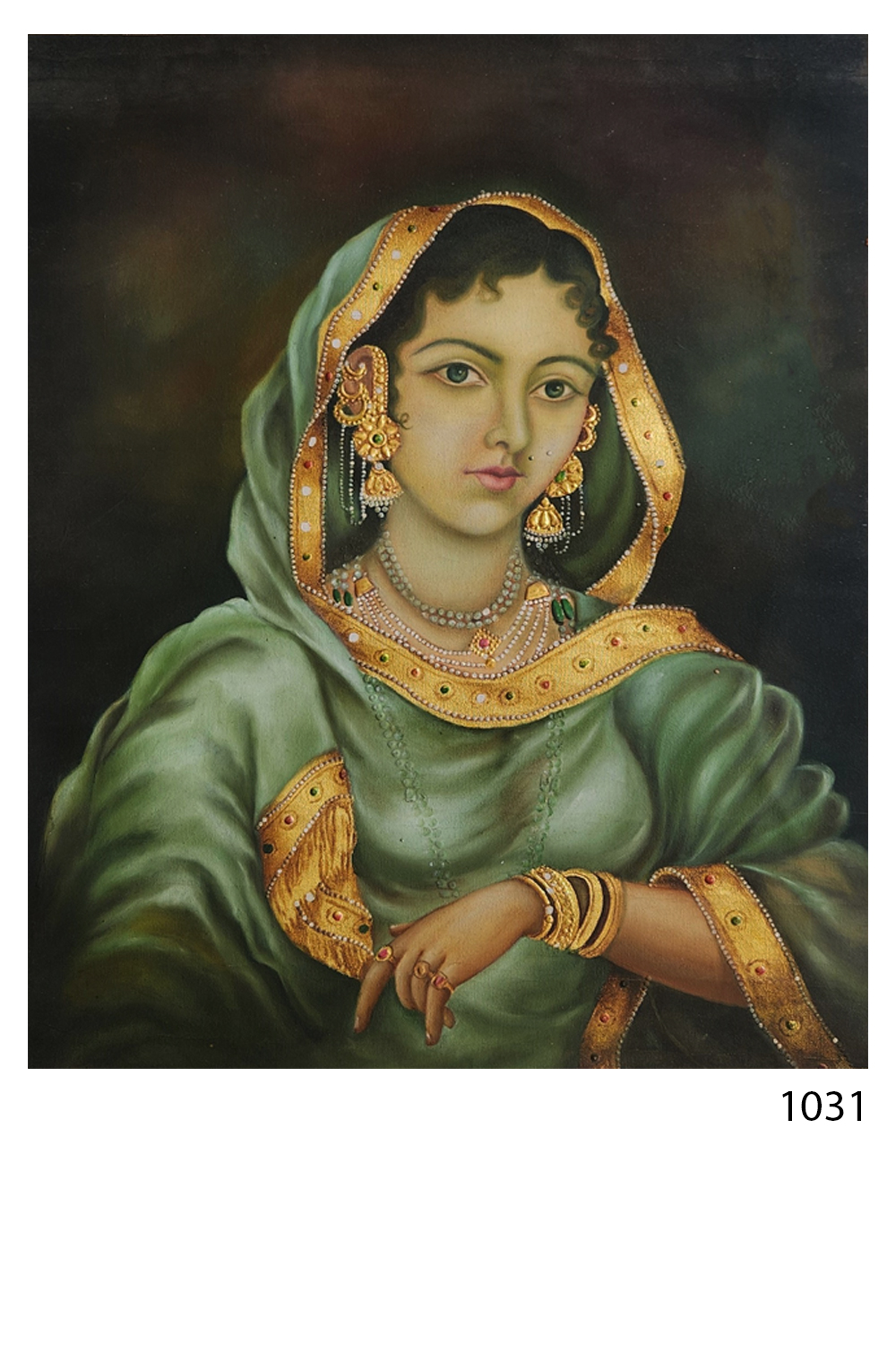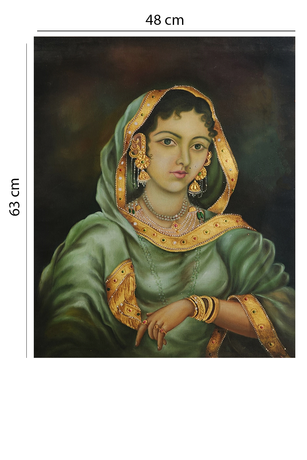 “Emerald Grace” is a richly detailed oil painting that captures the timeless elegance of a noblewoman from South Asian heritage. Dressed in a green garment with golden embellishments and a matching headscarf, she is adorned with intricate jewelry—gold earrings, layered necklaces, and bangles—that shimmer against the dark, dramatic backdrop. Her pose is poised and contemplative, with one hand resting gently on her lap and the other slightly raised, evoking a sense of quiet dignity and inner strength. Painted using original mineral pigments, the artwork reflects a deep reverence for classical portraiture and traditional aesthetics. This piece is ideal for collectors, cultural spaces, or interiors that celebrate feminine grace and historical richness.