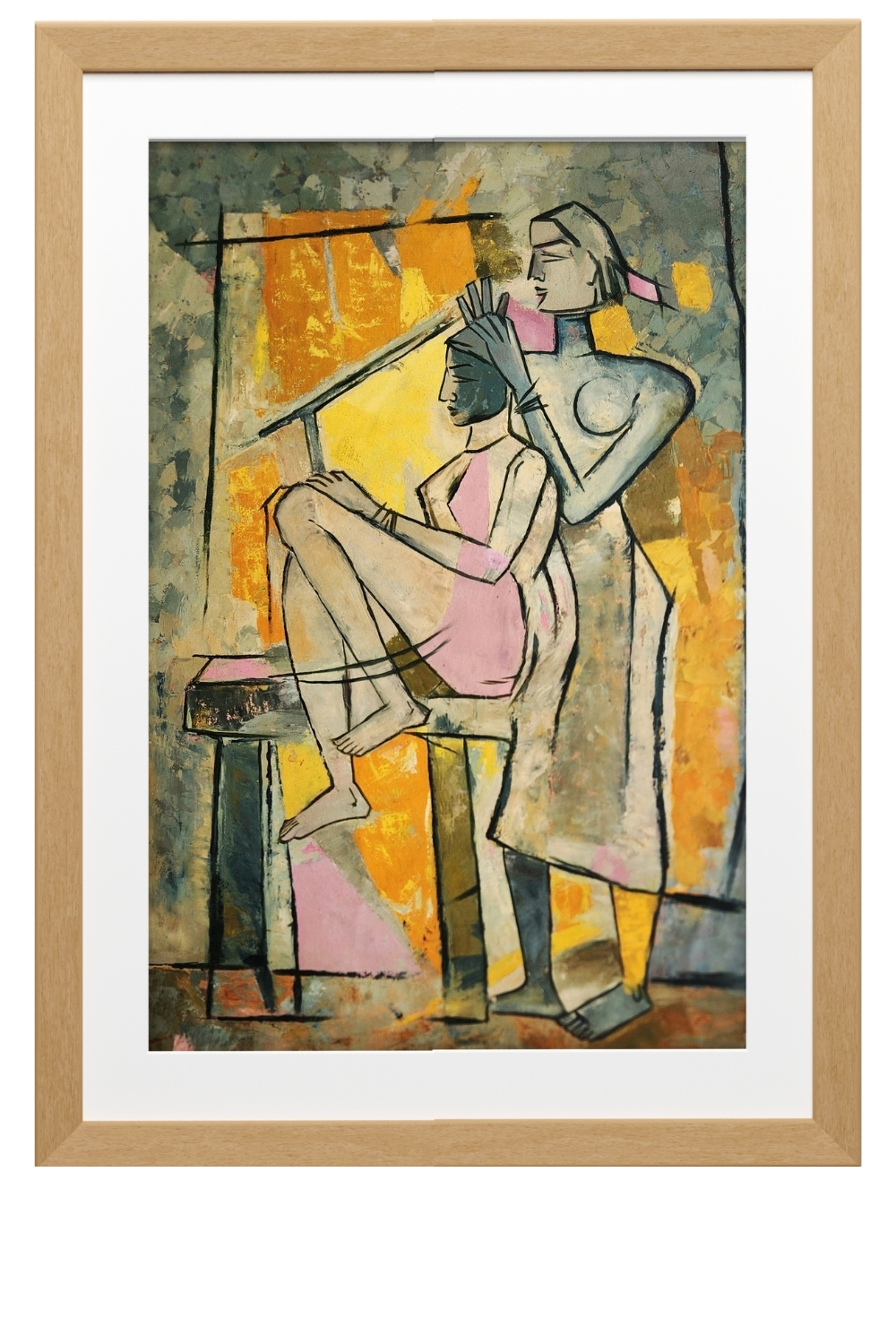Saaj-Shringar captures a quiet, tender moment between two figures—one seated, the other gently styling their hair. The composition, rooted in cubist abstraction, transforms a personal ritual into a visual symphony of shapes, shadows, and emotion. The figures are constructed through angular forms and expressive outlines, while the palette—soft pinks, muted yellows, greys, and blacks—evokes warmth and introspection. Painted with original mineral pigments, the artwork carries a tactile depth and timeless quality. This piece invites viewers to reflect on themes of companionship, care, and everyday intimacy, making it a striking addition to both modern and heritage-inspired interiors.