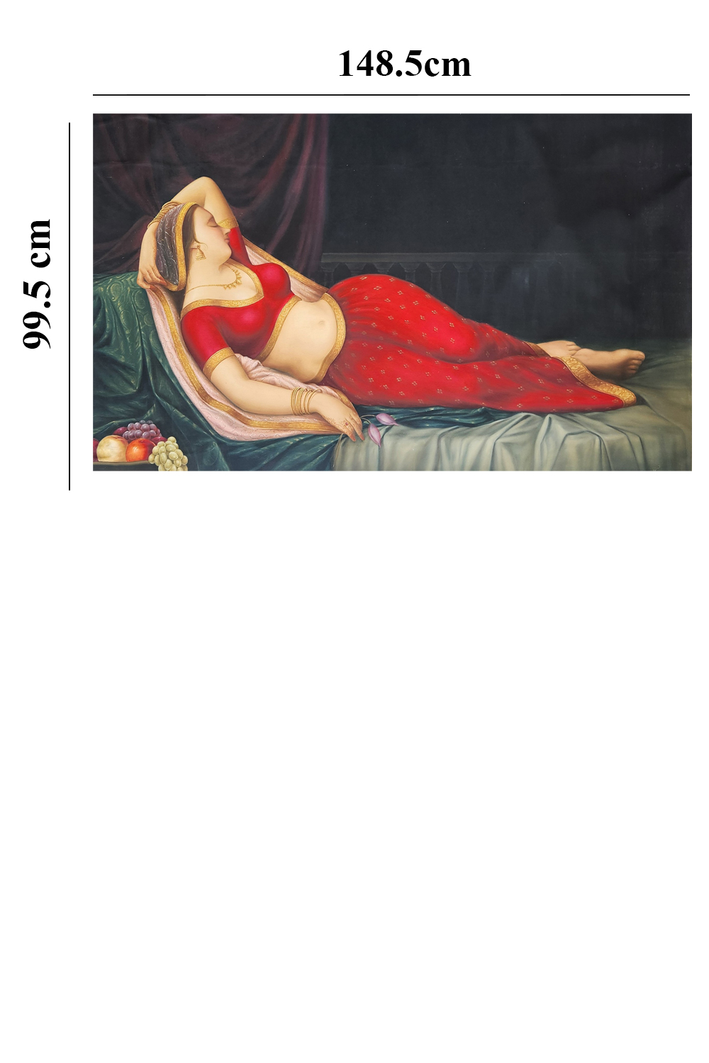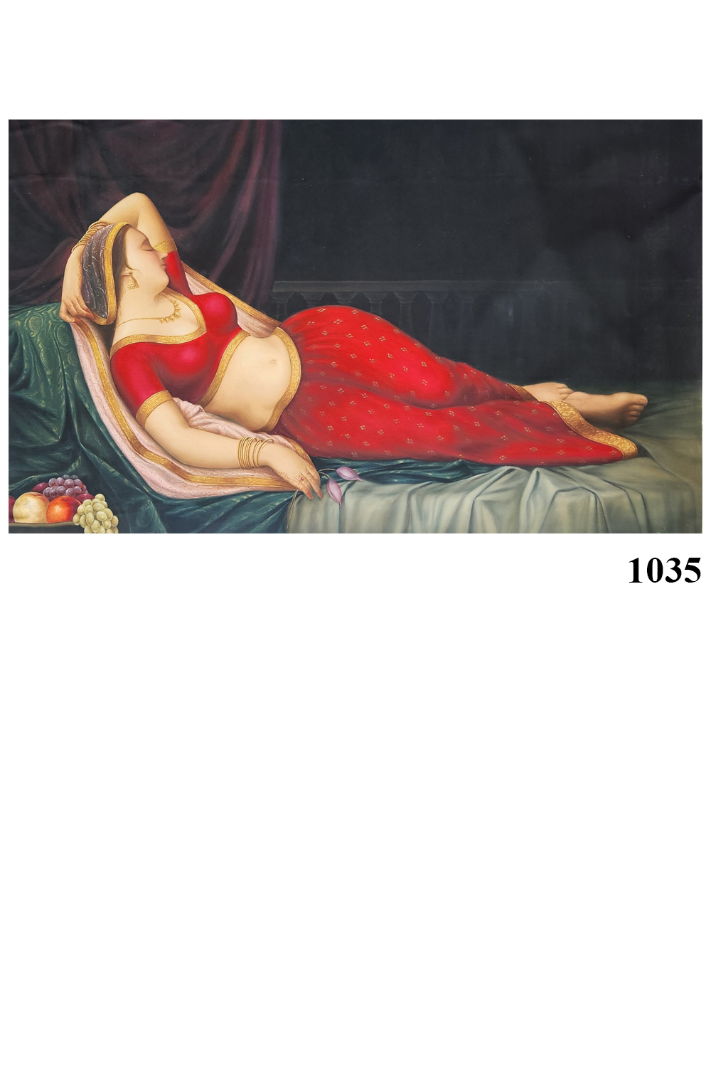 Vishraam captures a moment of serene elegance—a woman reclines gracefully on a plush divan, enveloped in the richness of traditional Indian textiles and jewelry. Her red sari, embellished with gold, flows around her like a tapestry of heritage, while her posture exudes quiet confidence and leisure. The dark, moody background hints at a luxurious interior, subtly framing her presence without distraction. A small arrangement of fruits near her adds a touch of domestic opulence. Painted with original mineral pigments, this oil artwork carries a timeless depth and tactile richness. It evokes themes of femininity, rest, and cultural pride, making it a striking centerpiece for interiors that celebrate Indian heritage and refined storytelling.