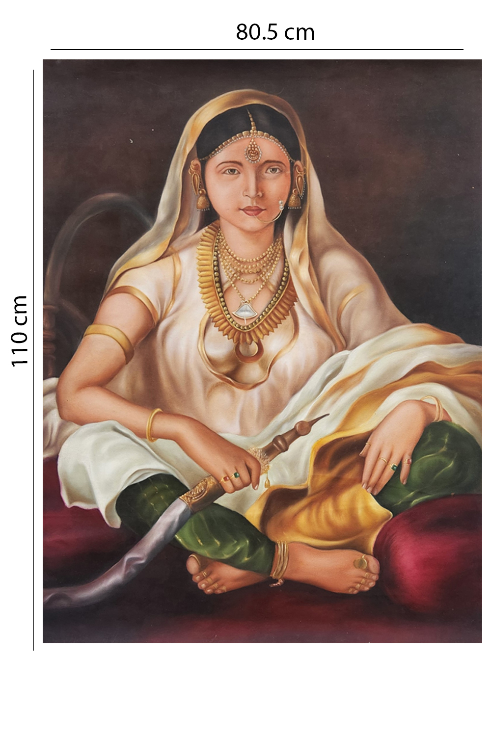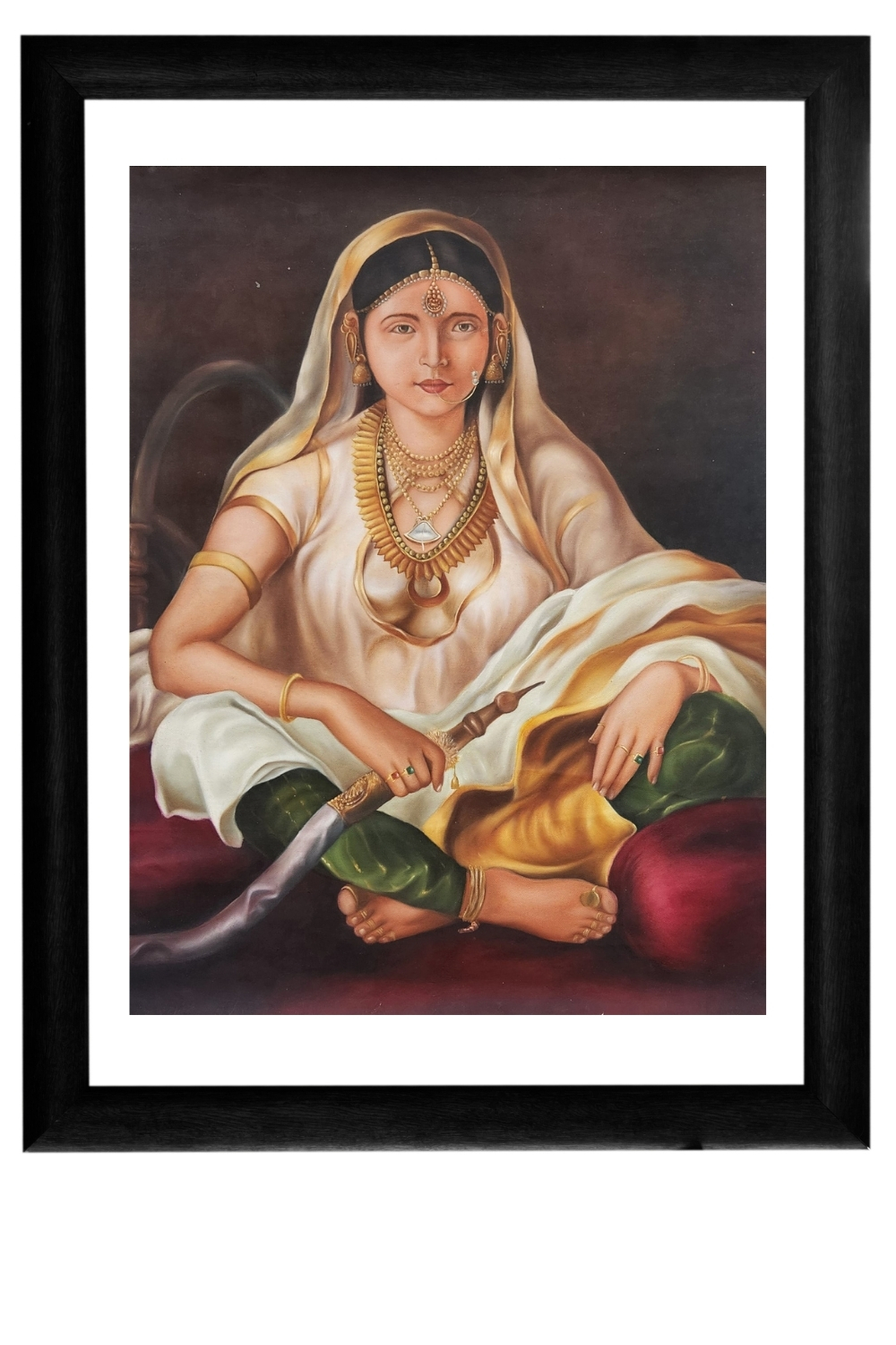 "Rajnayi: The Seated Sovereign" is a hand-painted oil artwork that celebrates the quiet power and elegance of Indian womanhood. Rendered in original mineral colors, the painting captures a queen-like figure adorned in intricate gold jewelry—maang tikka, bangles, necklaces—seated in serene command with a sword resting across her lap. Her white saree with golden borders and green leggings evoke purity and prosperity, while the dark backdrop intensifies her luminous presence. This piece is a tribute to feminine strength, cultural richness, and the layered storytelling of Indian portraiture. Ideal for collectors and connoisseurs of heritage art, it brings a museum-like aura to any space.
