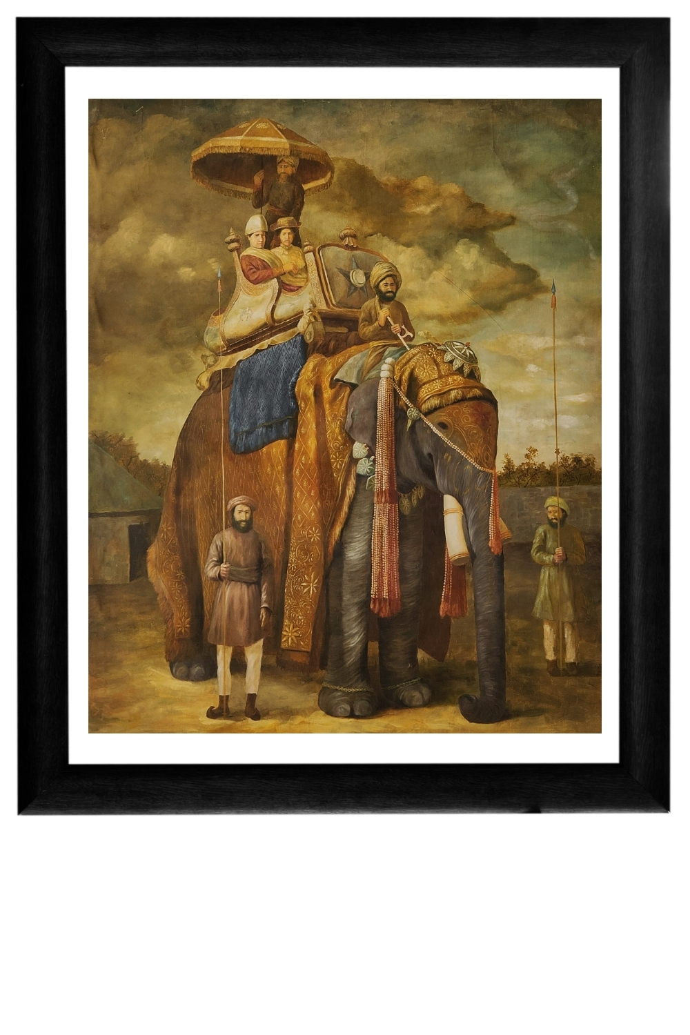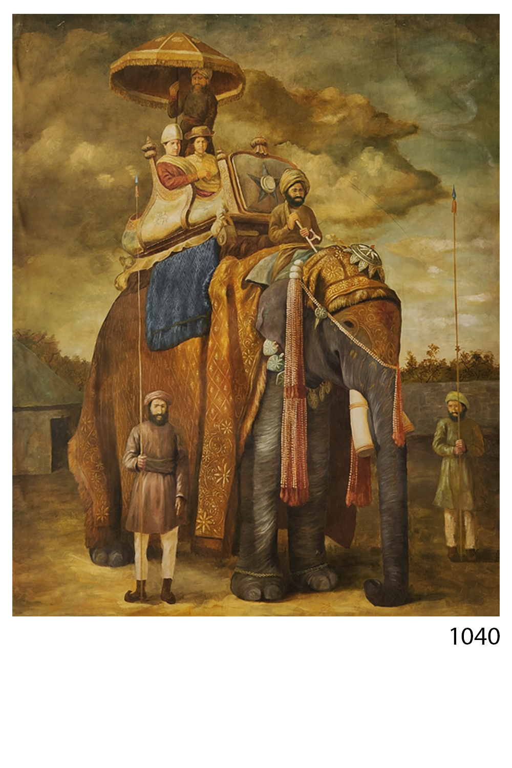 - Depicts a ceremonial royal scene with elephant, nobles, and attendants