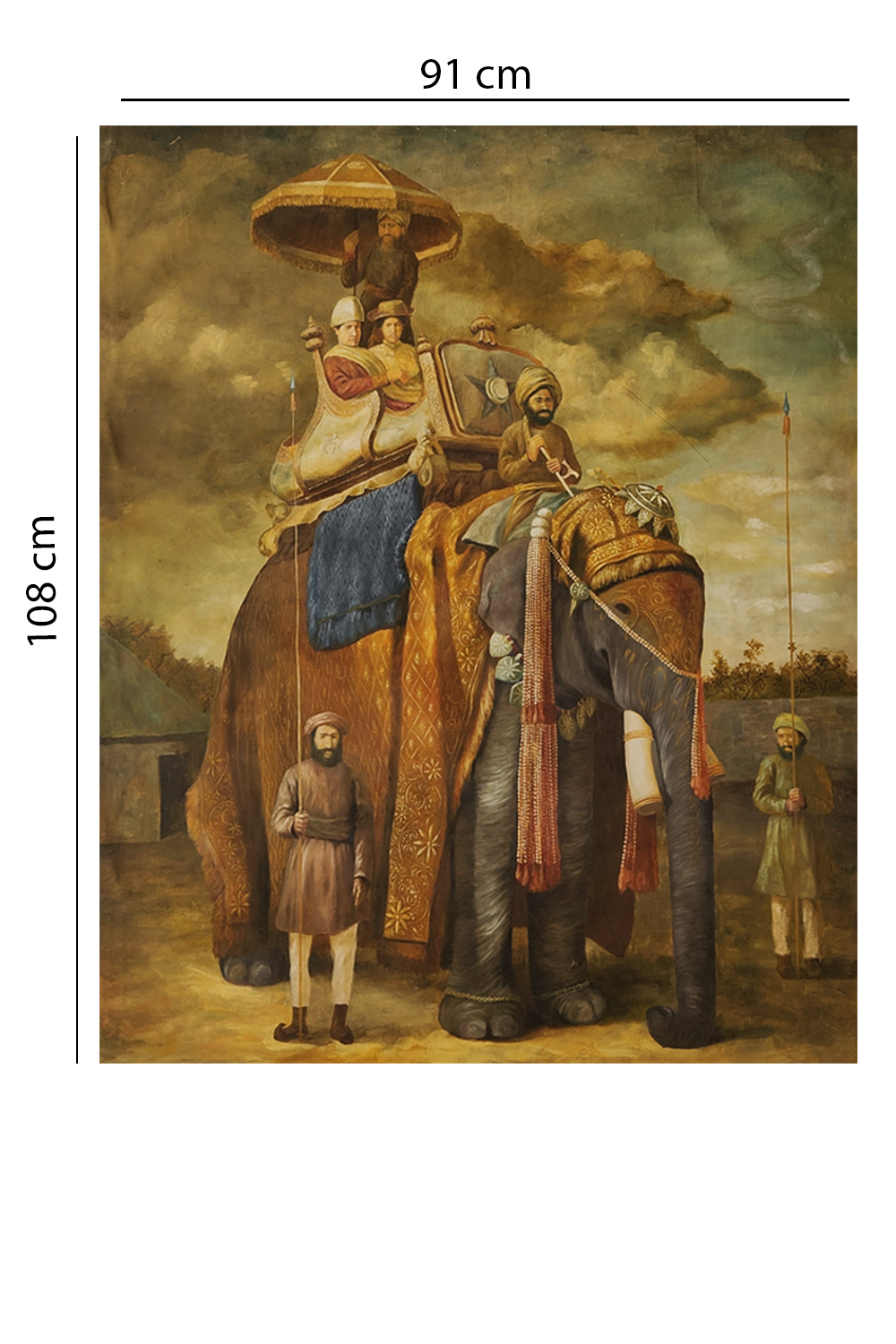 "Shahi Sawari: The Royal Procession" is a hand-painted oil masterpiece that celebrates the opulence and ceremonial traditions of historic India. At its heart is a richly adorned elephant, draped in regal fabrics and tassels, bearing a howdah filled with dignitaries under a parasol—a timeless symbol of status and reverence. Surrounding attendants and guards in traditional attire add rhythm and narrative to the scene, while the cloudy sky and distant structures evoke a sense of movement and occasion. Painted using original mineral colors, this artwork preserves the tactile richness and authenticity of Indian miniature and folk traditions, scaled to a commanding format. It’s a tribute to royal pageantry, artisan finesse, and cultural storytelling—perfect for collectors, heritage interiors, or campaign visuals that seek emotional and historical depth.