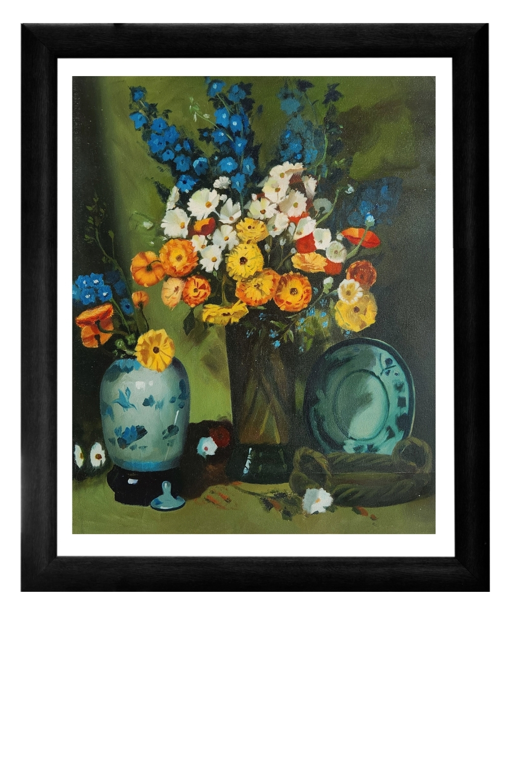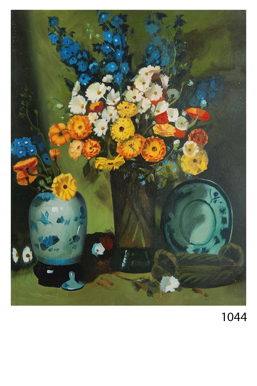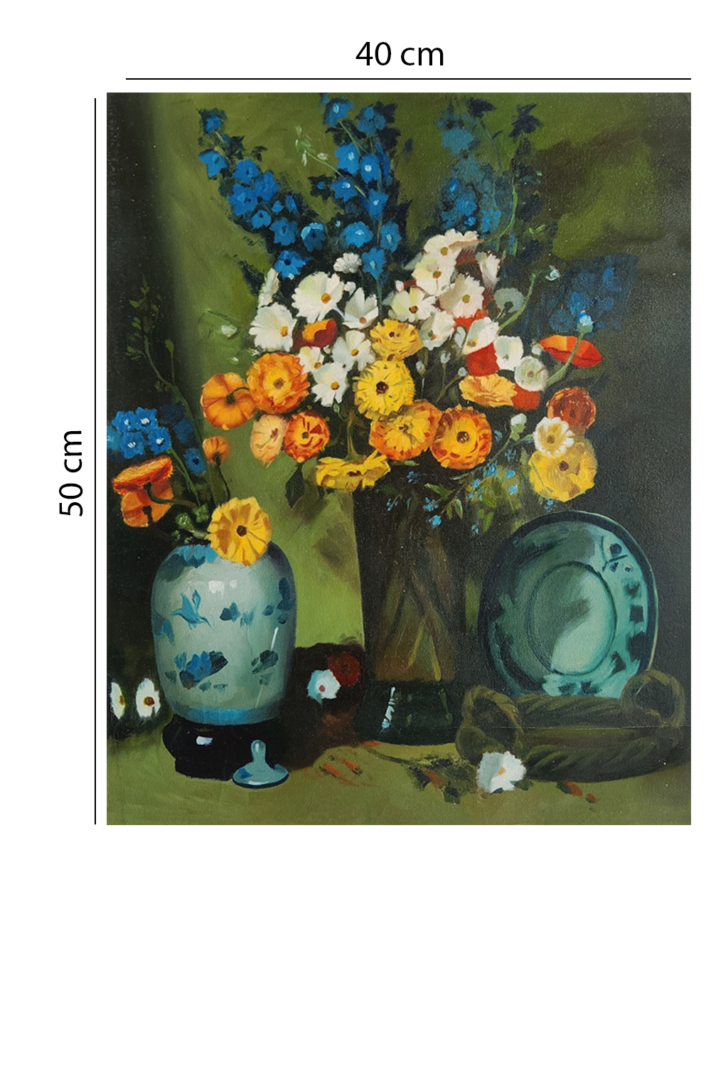 “Mehek-e-Guldaan” is a hand-painted silk artwork that captures the timeless grace of floral still life with a painterly touch rooted in heritage. Two vases—one tall and transparent, the other ceramic with blue floral motifs—cradle a vibrant bouquet of blue, white, yellow, and orange flowers. Scattered petals and objects rest gently on the table, while a muted green backdrop lends depth and calm. Painted with original mineral colors on silk, the piece radiates softness, luminosity, and tactile richness. Ideal for refined interiors, catalog presentation, or poetic campaign visuals, it invites viewers into a moment of quiet abundance.