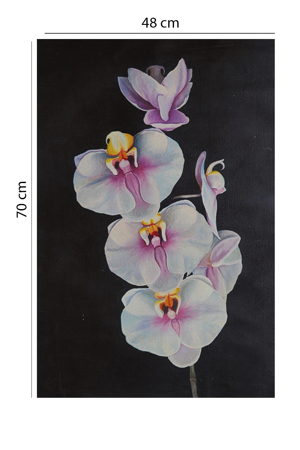 “Nargis Ki Chhaya” is a hand-painted canvas that celebrates the delicate beauty of orchids through a refined, heritage-inspired lens. Set against a deep black backdrop, the vertical arrangement of white orchids—tinged with soft pinks, purples, and golden centers—evokes both realism and poetic restraint. Each petal is rendered with precision, using original mineral colors that lend depth, texture, and timeless vibrancy. The composition invites stillness and contemplation, making it ideal for curated interiors, campaign visuals, or collectors seeking botanical elegance with cultural soul. This piece is a tribute to nature’s quiet grandeur, painted with emotional clarity and artisan finesse.