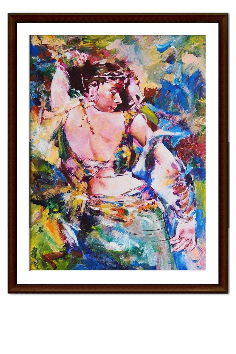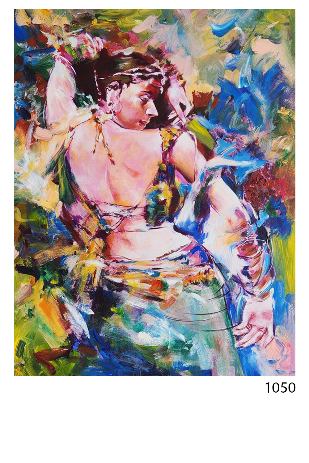 “Nritya Ki Leher” is a hand-painted canvas that captures the raw energy and grace of dance through bold brushwork and vivid hues. Depicted from behind, the dancer’s raised arms and turned torso suggest fluid movement, while her flowing costume adds rhythm and texture to the composition. The abstract background—alive with pinks, blues, greens, and yellows—echoes the emotional intensity of performance. Painted using original mineral colors, this piece carries the tactile richness and luminosity of traditional Indian artistry. Whether displayed in curated interiors or used in campaign storytelling, it evokes motion, celebration, and the expressive power of the human form.