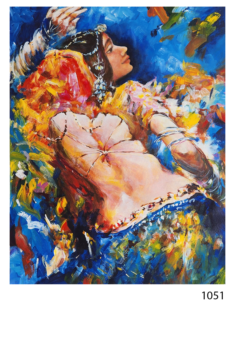 “Rang Raas” is a hand-painted canvas that celebrates the expressive beauty of Indian dance and cultural adornment. The central figure, dressed in richly textured traditional attire and embellished with jewelry, is caught mid-motion—arms raised, body alive with rhythm. The abstract background bursts with vibrant hues of blue, yellow, orange, and red, echoing the emotional intensity of performance and festivity. Painted using original mineral colors, this artwork carries the tactile richness and luminosity of heritage technique. Ideal for curated interiors, campaign storytelling, or collectors seeking dynamic elegance, it evokes movement, tradition, and the joy of artistic expression.