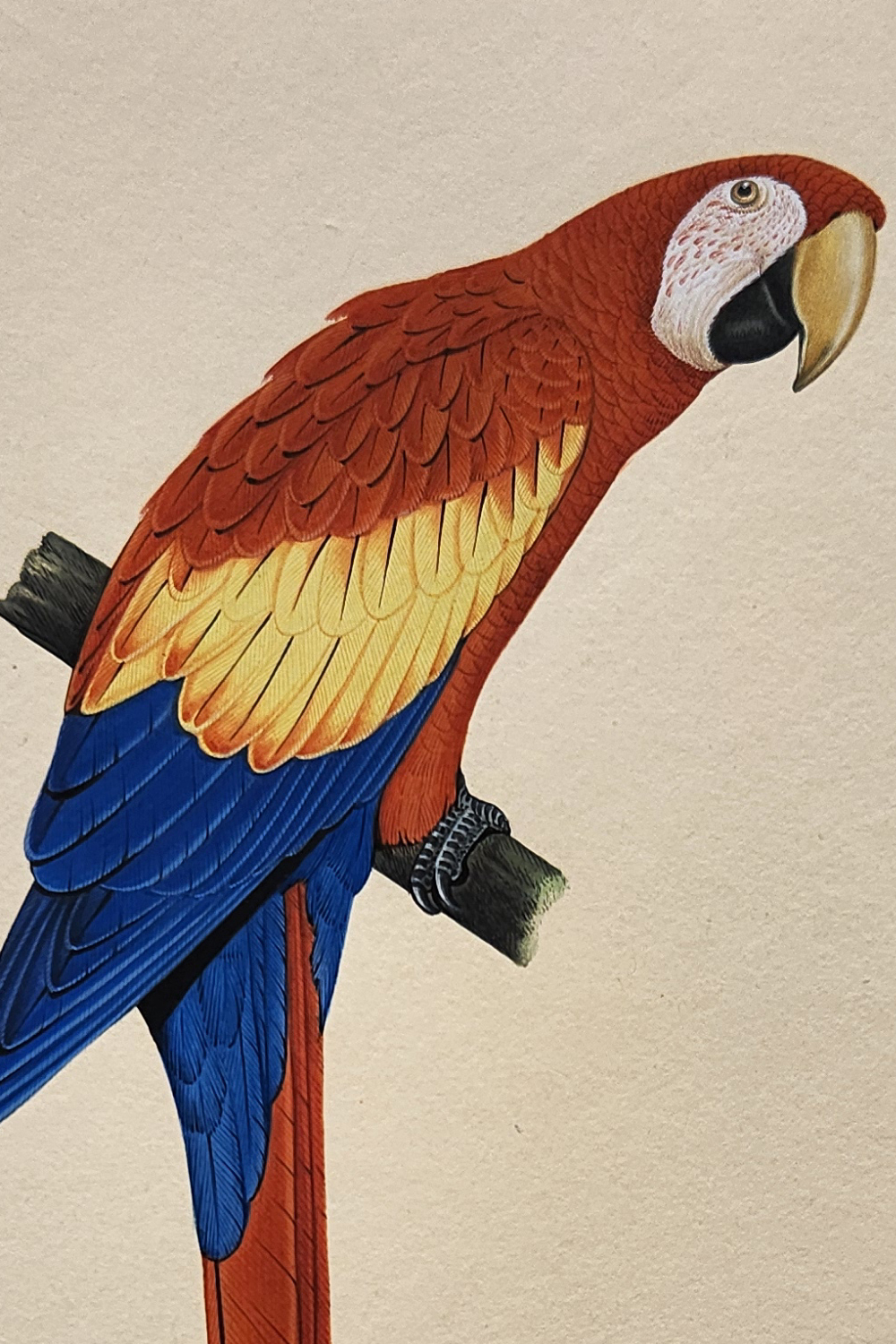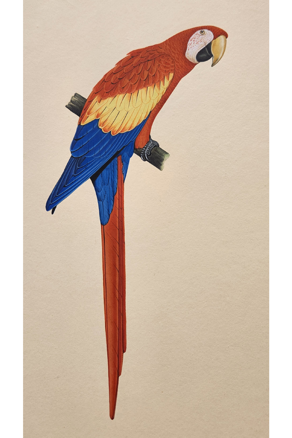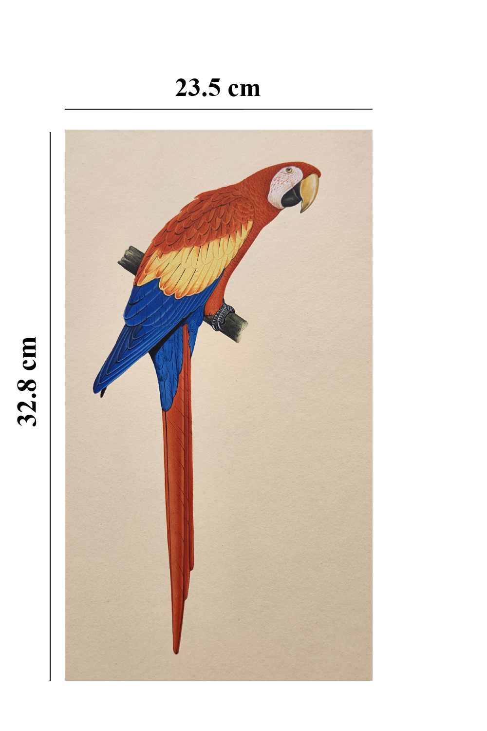The Crimson Azure Parrot Miniature Painting beautifully captures the vivid, reddish-blue tones of the parrot, highlighting its subtle elegance and natural beauty. Each detail of this hand-painted artwork is meticulously crafted on premium art paper, ensuring both durability and vibrant color reproduction. Its vertical orientation makes it an ideal choice for narrow spaces, while its lightweight design allows for easy framing and integration into various decor styles. Please note that the frame shown in the image is not included in the price but is available upon request at an additional cost. To preserve the painting's exquisite colors, avoid direct sunlight and clean gently with a soft cloth.