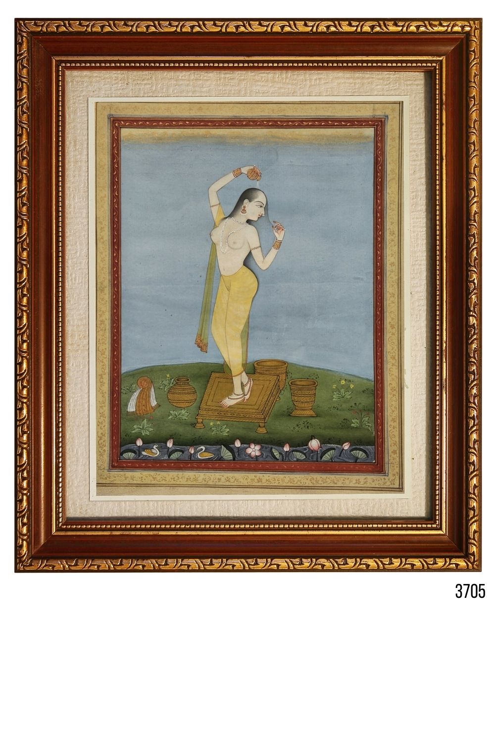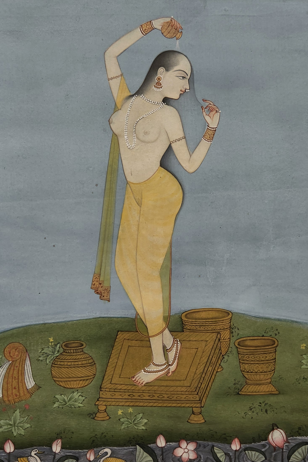 Step into the realm of subtle allure with the Silent Elegance Miniature Painting. This artwork, featuring a poised nude figure, showcases the beauty of simplicity through its delicate brushwork and minimalist style. Each stroke brings the figure to life, exuding grace and understated elegance. This handcrafted painting is perfect for enhancing intimate spaces like bedrooms or private collections, adding an air of sophistication and calm. The vertical orientation and compact size make it ideal for smaller walls or gallery setups, where it can command attention without overpowering the space.