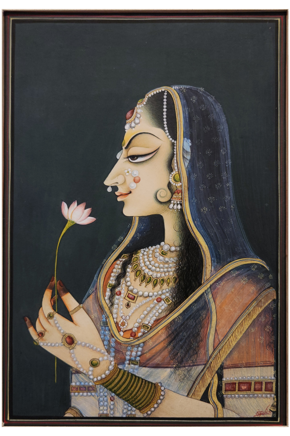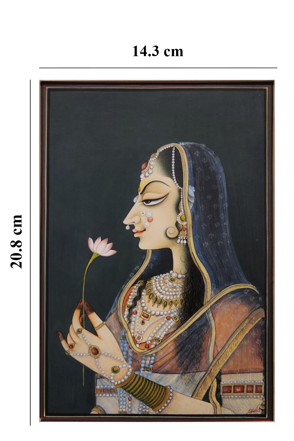 The Bani Thani Painting is a classic representation of Rajasthani art, known for its intricate detailing and elegance. Inspired by the graceful features of the legendary Bani Thani, this painting captures her distinctive sharp facial features, arched eyebrows, and serene expression, making it a symbol of royal beauty. The delicate brushwork and vibrant colors reflect the traditional craftsmanship of Indian miniature paintings. Perfect for art collectors, this piece adds a touch of cultural richness to any space, making it a timeless addition to any home or office.